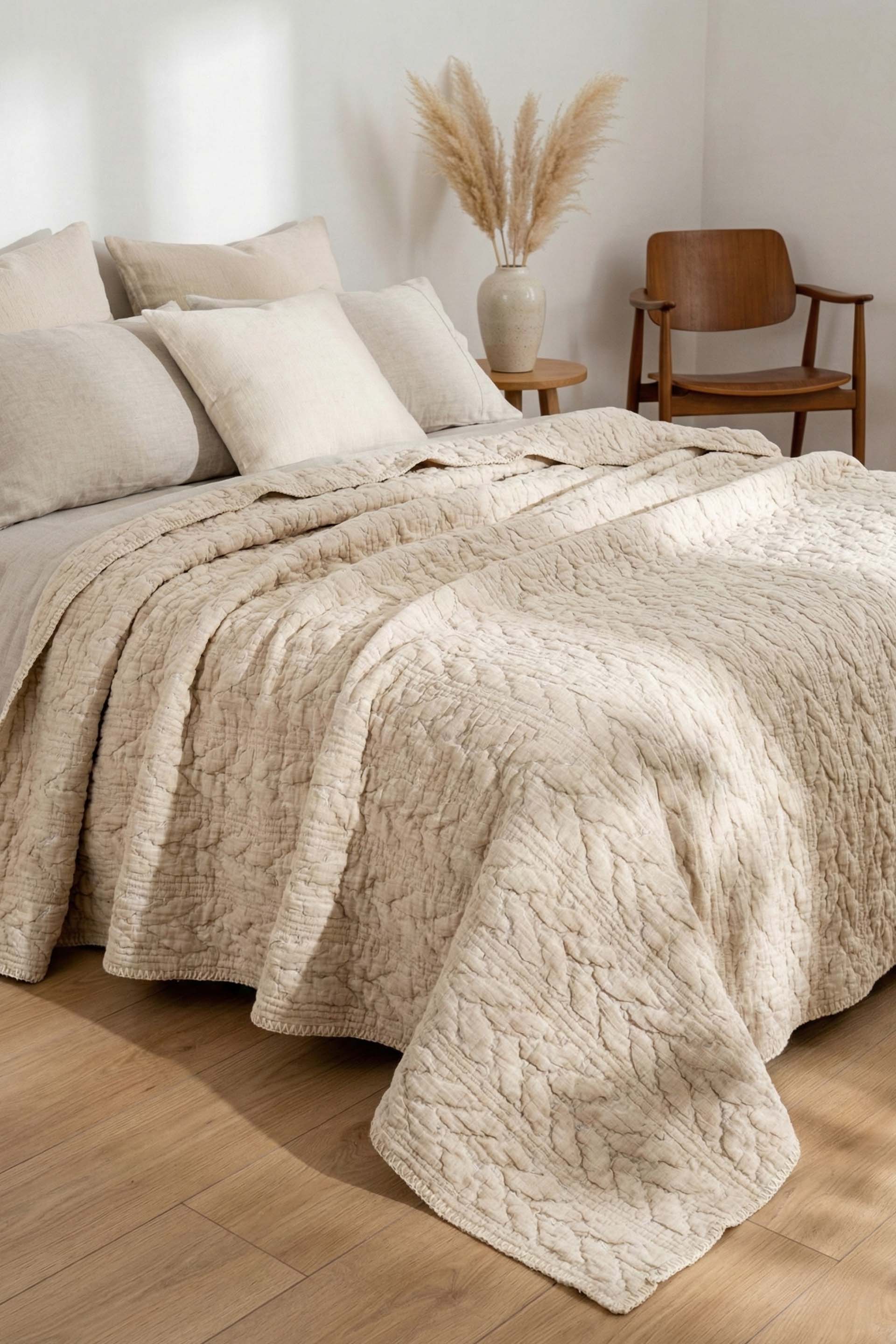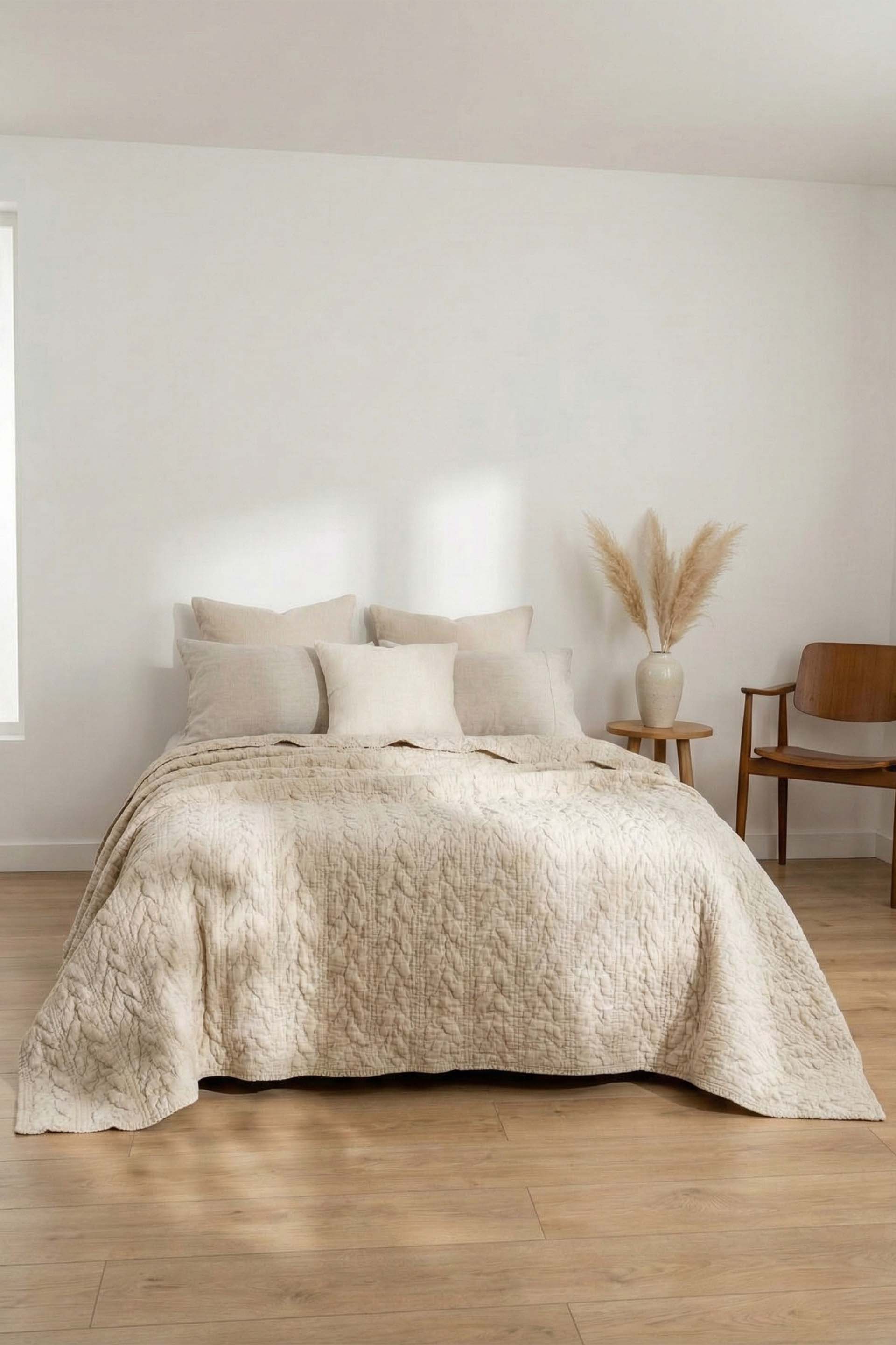 Helen yatak örtüsü, minimalist ve modern dekorasyon anlayışına mükemmel uyum sağlar. Natural renk tonu, her türlü iç mekan paletine kolayca entegre olur ve zamansız bir estetik yaratır.