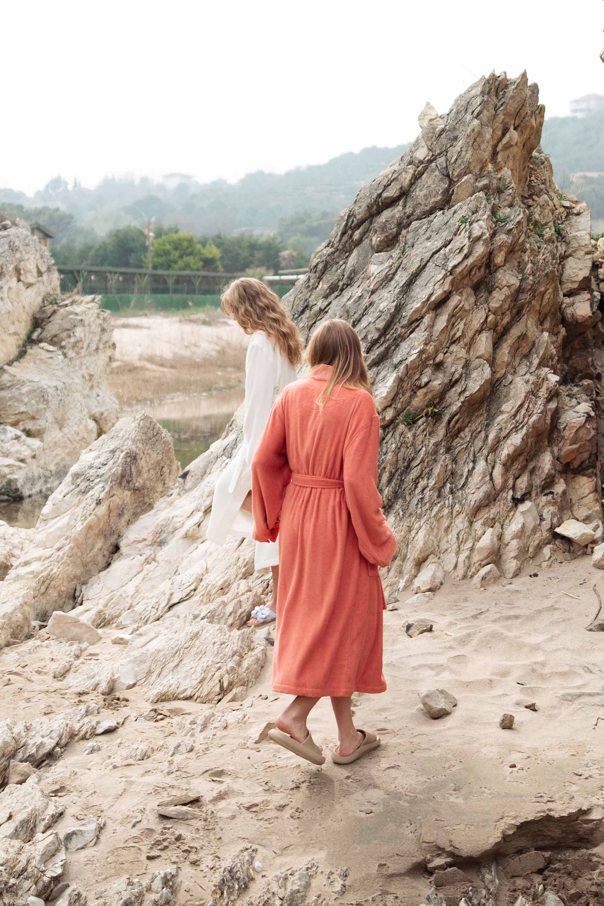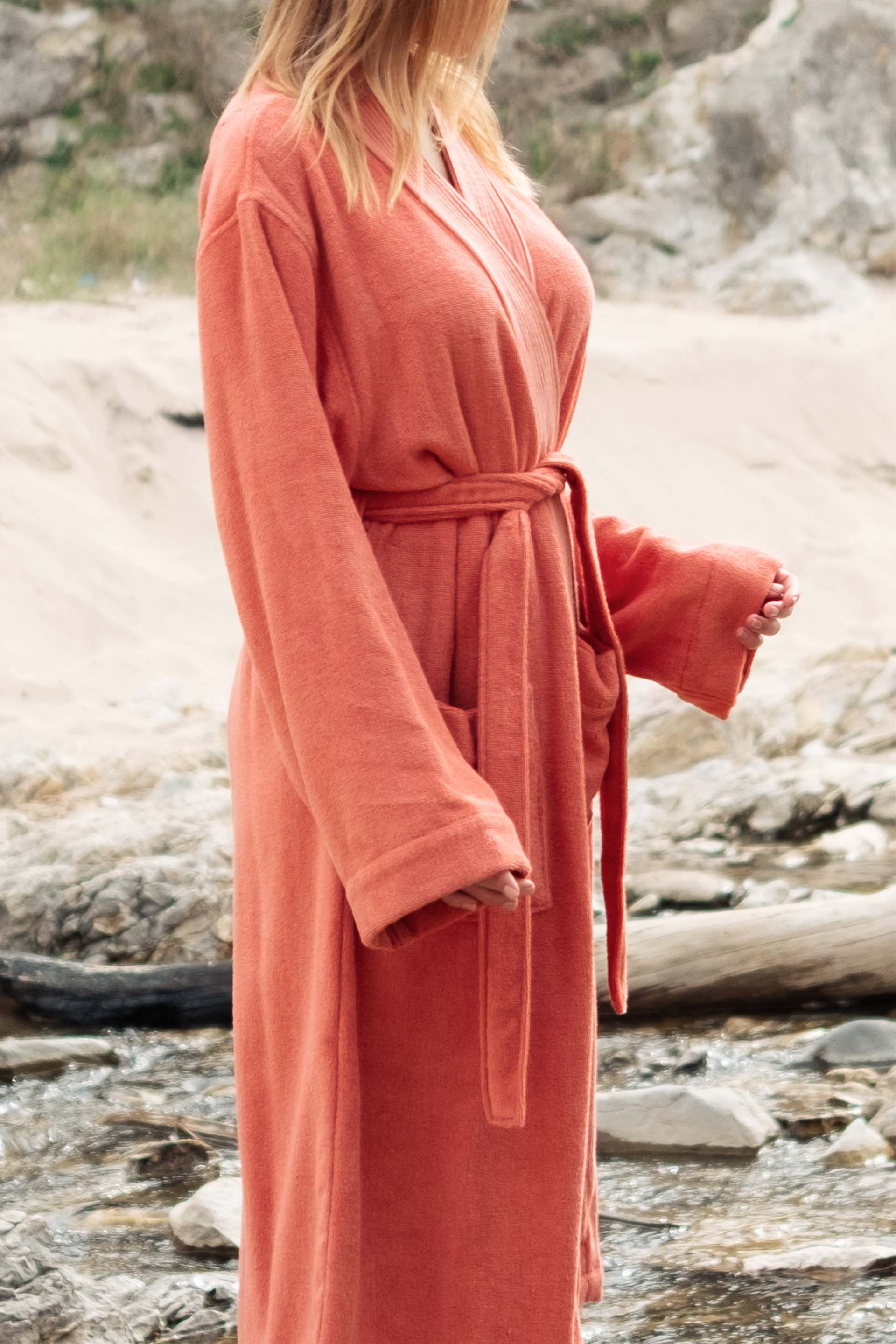 Lavinia Bornoz, TENCEL™ ipliğin verdiği yumuşaklığı hissettirirken, yüksek su çekme özelliği ve esnek yapısı ile banyo keyfinin son adımında tazelik hissini yaşamanızı sağlar. TENCEL™ ve pamuk karışımından üretilen hem erkek hem kadın için bu bornoz, banyo keyfinizde yumuşaklık ve uzun süreli dayanıklılık arayanlar için mükemmel bir tercihtir.